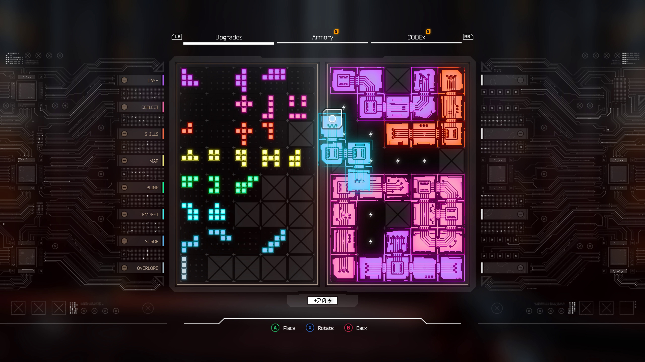 Ghostrunner cuenta con una serie de habilidades desbloqueables que pueden ayudar o hacer más fácil el recorrido de la campaña, principalmente en los combates. Sin embargo, no permite elegir todas las que hay disponibles, sino que obliga a crear un rompecabezas estilo Tetris (ya que las habilidades son como módulos de energía con diferentes formas) para configurar nuestras habilidades en todo momento. Se pueden cambiar en tiempo real e ir probando, pero claramente la configuración es propia y personal, ofreciendo a cada jugador un estilo totalmente autónomo. Muchas habilidades permiten modificar la partida y cambiar las tornas en los enfrentamientos, como por ejemplo ralentizar el tiempo y atacar a un enemigo rápidamente mientras lo fijamos, siendo extensible a varios más si se encuentran en fila.